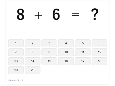 15 | たしざん・ひきざん | ![]() | 「足し算」「引き算」という言葉に馴染みのないお子さんから、繰り上がり・繰り下がりの計算に取り組むお子さんまで、幅広く使えます。足し算引き算の和や差が5まで5のみ10まで10のみ20までの繰り上り繰り下がりの計算まで選択することができます。計算式しか出ないので、必要に応じて、おはじき・タイル・指などを用意してください。 https://school.gifu-net.ed.jp/cyuno-sns/public/tasuhiku.html |