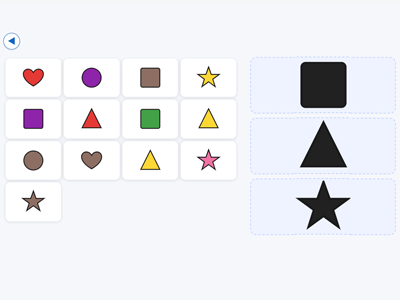 17 | いろとかたち | ![]() | 色と形が異なるカードをドラッグまたはタッチで、同じ形や色の箱に分類して入れます。違う箱に入れようとしても入らず、不正解音が鳴って元の場所に戻ります。全て入れ終わると正解音が流れて次の問題が出題されます。ミッションでは、赤色の三角などの指定されたカードを選んで入れます。設定で使用する色や形、箱やダミーの数などの調整が可能です。 https://school.gifu-net.ed.jp/cyuno-sns/public/irokatachi.html |
