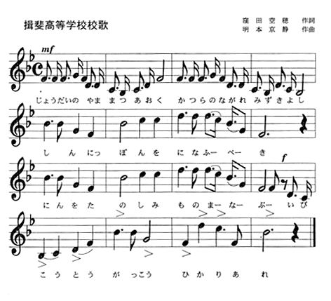 1.城台の山 松青く 桂の流れ 水清し 新日本をになふべき 任を楽しみ 物学ぶ 揖斐高等学校 光あれ