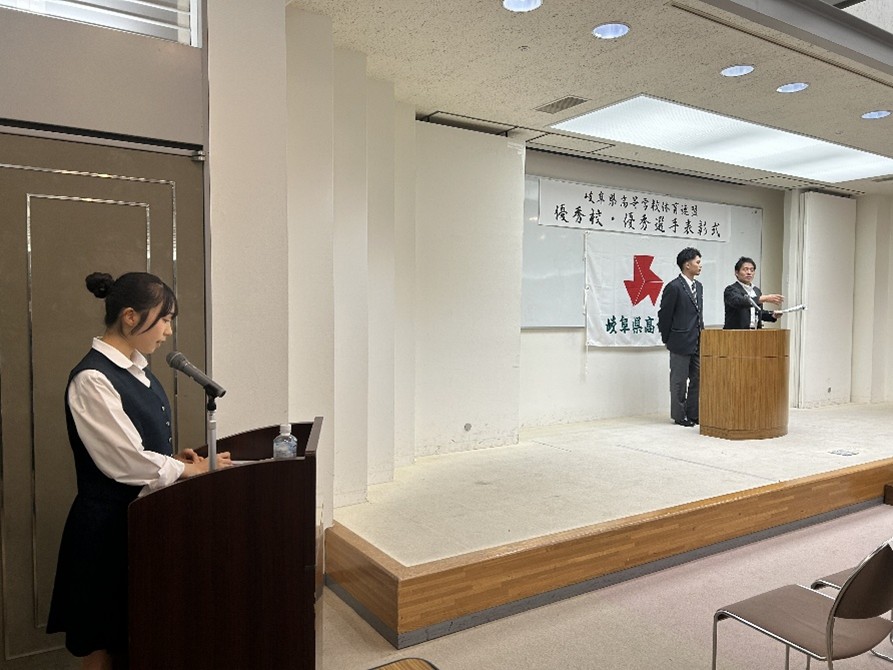 本校放送部の廣瀬明音さんが、岐阜県高等学校体育連盟の表彰式の司会進行を務めました。岐阜県を代表して活躍された運動系部活動の皆さんの立派な姿を拝見し、こちらまで元気をいただきました。 |