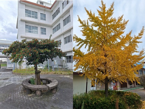 本校中庭の木々が、見頃となりました。 黒金黐(クロガネモチ)とイチョウの木々です。 |