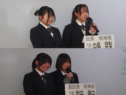 本日7限LHRの時間は、前期生徒会役員の立会演説会(Web)でした。立候補者、応援演説者ともに緊張しながらも、自分の思いをしっかりと語ってくれました。 |