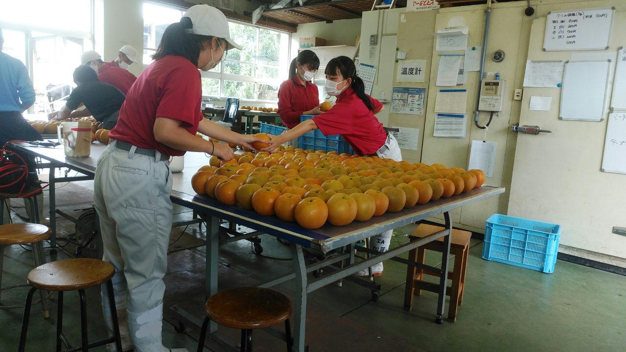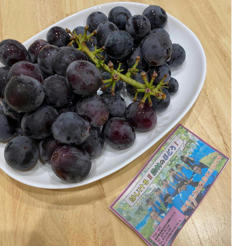 The card below the grapes in the photo reads, "Delicious grapes! Nourin's grapes!" along with a photo of the producer(our students)