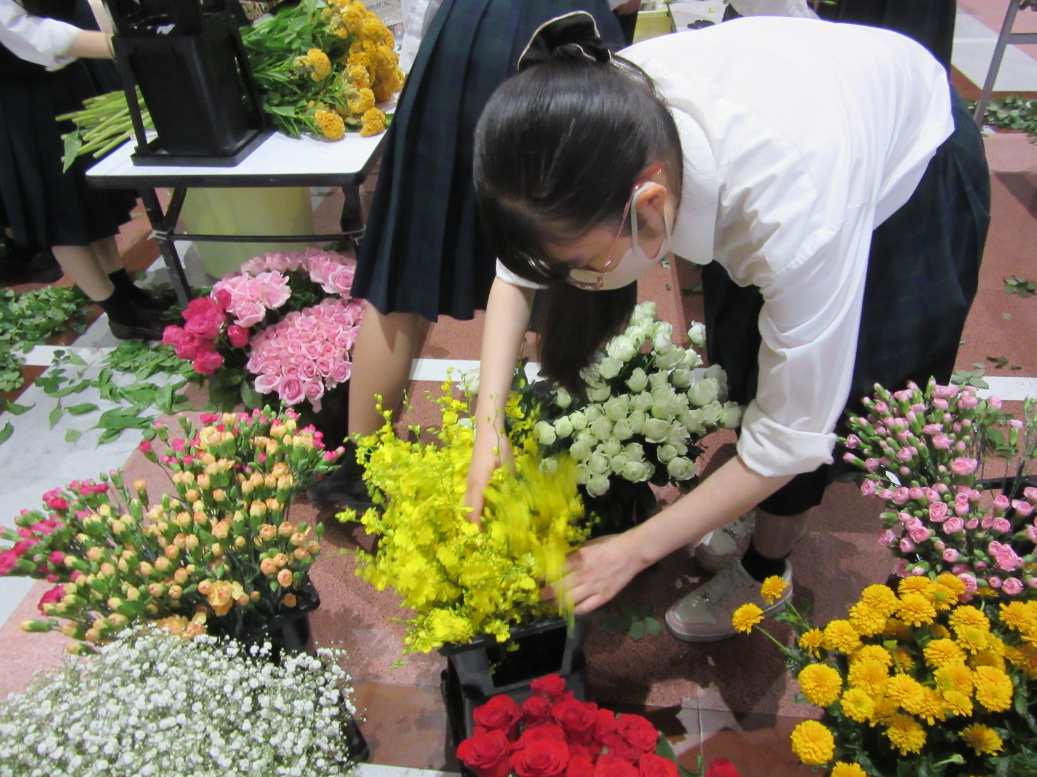 Students sell many kinds of the flowers.They greet guests wearing their trademark aprons.