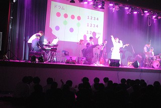 続く本編では、Familleによる多彩なカバー曲の演奏に加え、ライブマナーについてのレクチャーが行われ、会場は一気に音楽の世界に引き込まれました。さらに、生徒代表がピアノ・ドラム・ギターの演奏体験に挑戦し、実際に音を奏でる貴重な機会となりました。