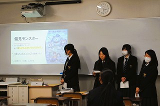 理数科では2年生から3年生にかけて理数探究の授業で課題研究を行っています。他の生徒や先生から疑問やアドバイスが出され、これからの研究の参考となりました。
