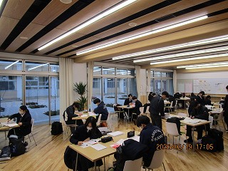 新校舎1階のコモンホールにて、多くの生徒が放課後の自主学習に取り組んでいます。