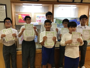 当校を会場として7月4日(金)に行われた第1回日本漢字能力検定 において、多くの児童生徒が受検し、合格を手にしました。合格者の中 には、毎日のように学習に励んで努力を積み重ねた結果、素晴らしい結 果を残すことができた人もいます。 合格者の皆さんは、大竹陽平校長から合格証書を受け取り、誇らしげ な表情をしていました。また、校長から「とてもよく頑張りましたね」 と、ねぎらいの言葉をかけてもらい、嬉しそうにしていました。 合格した皆さん、おめでとうございます! これからもいろいろなこ とにチャレンジしていってください! |