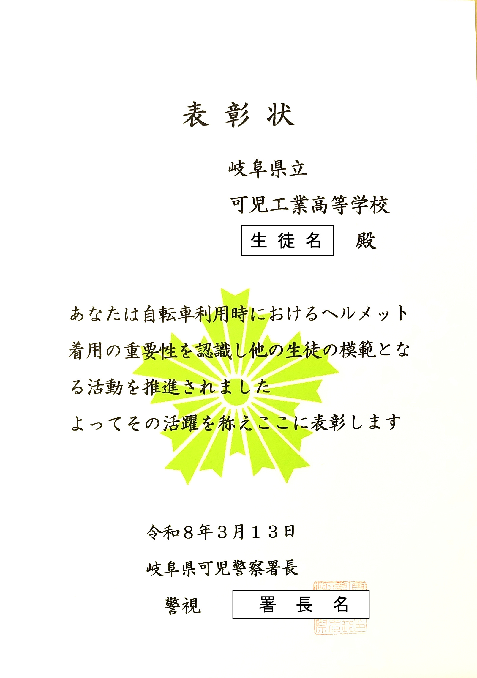 3月13日(金)にヘルメット着用等の交通安全教育の推進に熱心に取り組んだ学校として警察から本校が表彰されました。