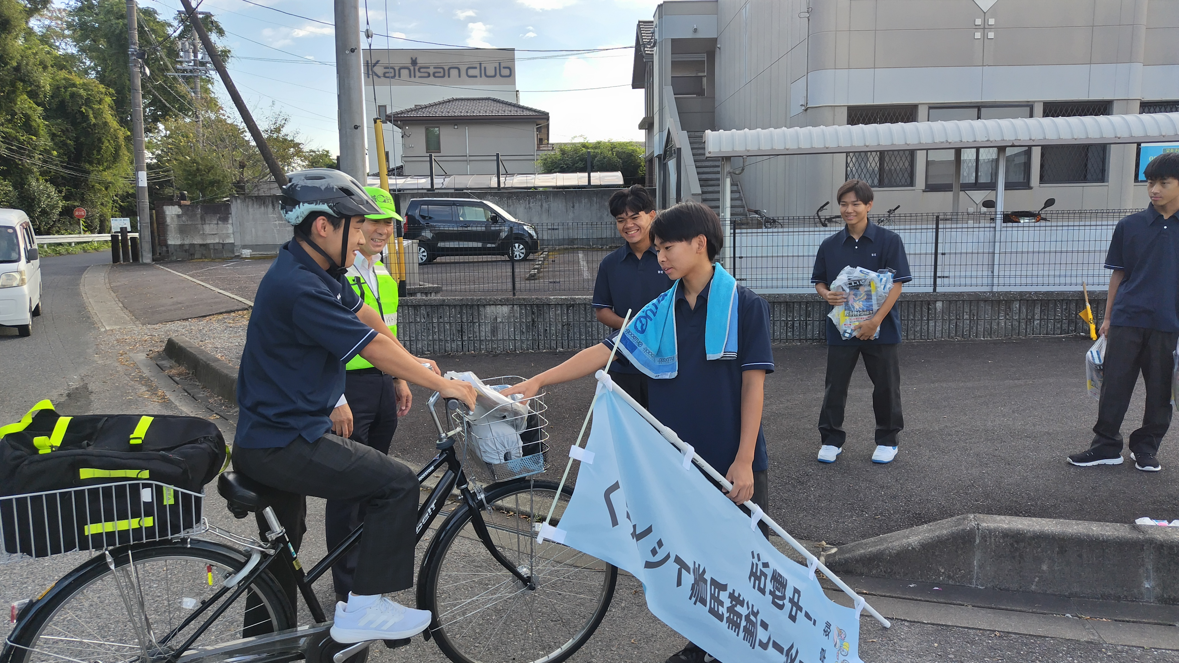 通行する高校生に反射材や交通安全啓発のチラシを配布しました。