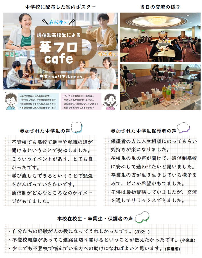 本校通信制課程に在籍している方の多くが中学時代に不登校を経験しています。そのような実体験を踏まえて、現在不登校で悩まれている中学生やその保護者の方との交流の場を設けました。