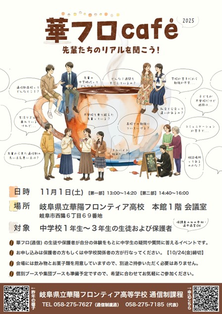 昨年度に引き続き、今年度(令和7年度)も華フロcafeを開催します。各中学校宛に案内を配布しておりますが、イベントの内容につきましてご質問等がございましたら、華陽フロンティア高校通信制課程(058-275-7627)までご連絡ください。中学3年生だけでなく、中学1・2年生もご参加いただけます。次のURLからも申し込みが可能ですので、よろしくお願いします。