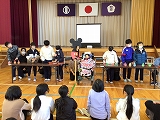 中京高校と交流学習を行いました。ダンス「絆」の交流では、カラフルな衣装を着た高校生のダイナミックな踊りにとても魅了されました。その後、クラスごとに高校生が入って一緒に踊り、細かい動きやターンのタイミング等について教えてもらって、今までより上手に踊れるようになりました。学年交流では、生徒が考えた巨大オセロや中京高校の生徒が考えてきてくれた紙飛行機飛ばし等をしてお互いの仲を深め、とても楽しい時間を過ごすことができました。