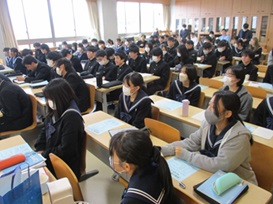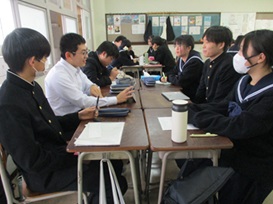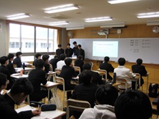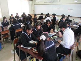 2年次生全クラスと1年次生普通科の生徒が12会場に分かれ5~6名(内2名が発表者)のグループを作り、発表5分+意見交流5分の計10分を、前半2サイクル+後半2サイクルの形式で行いました。