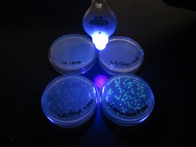 大腸菌の遺伝子組換えを行い、紫外線で光る大腸菌をつくりました。