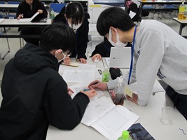 「総合的な探究の時間」に普通科1年次生を対象にした探究基礎講座を実施しました。物理・化学・生物の各分野において1週ごとに実験を行い、実験を通して探究のプロセスを学びました。