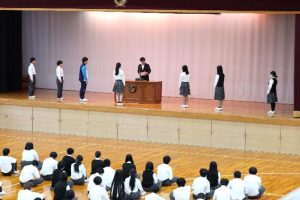 後期始業式を行いました。英語スピーチコンテスト県大会に出場する安藤さんが思いのこもったスピーチを披露しました。後期も一人一人が個性を発揮して活躍しながら成長することを期待しています。