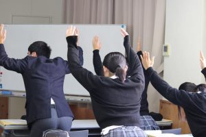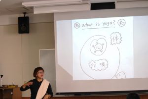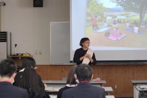 心と体を繋げるものがヨガであり、体を動かすと心が穏やかになると話してくださいました。生きていく上で一番必要な呼吸を意識した運動でもあり、呼吸をしっかりするためには姿勢が大切だと、生徒も日頃の自分自身の姿勢など見直すことができました。いすヨガも体験でき、心が落ち着き、体が動いていることを体感できました。