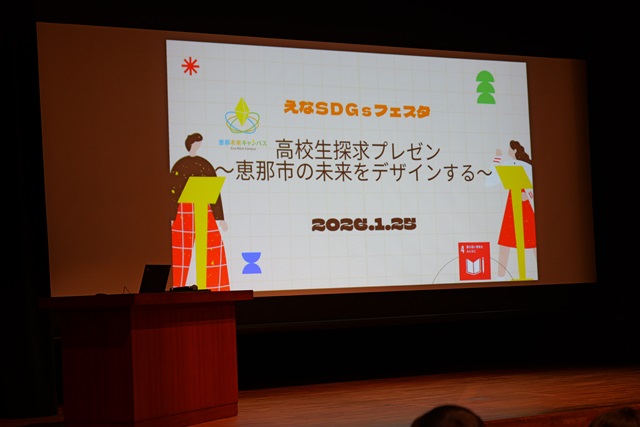 恵那市高校生探究プレゼン参加(R8/1/25) 投稿日時: 2026年1月25日 投稿者: 管理者 恵那文化センターにて「えなSDGsフェスタ」が開かれ、本校生徒が「高校生探究プレゼン」として発表を行いました。発表者は事前に恵那市在住のタレント・フリーアナウンサーの西村知穂さんによるプレゼン講座を受講しましたが、本番はその成果をいかして優れた発表を行い、講評でも高い評価を頂きました。 発表内容 観光資源研究:「自治の探究」(田中勝大・大野雄貴) 卒業研究:「デザインの力で恵那市の魅力を伝える」(市川凜)