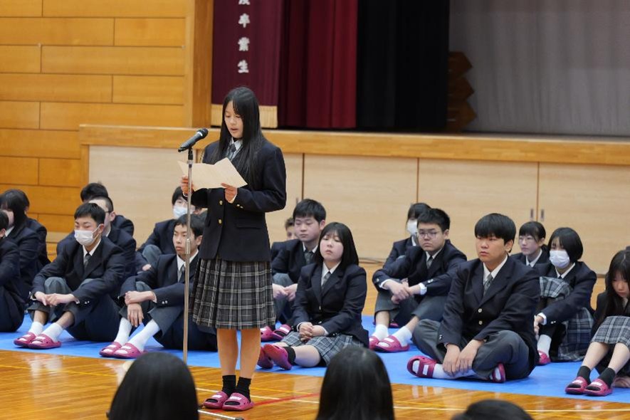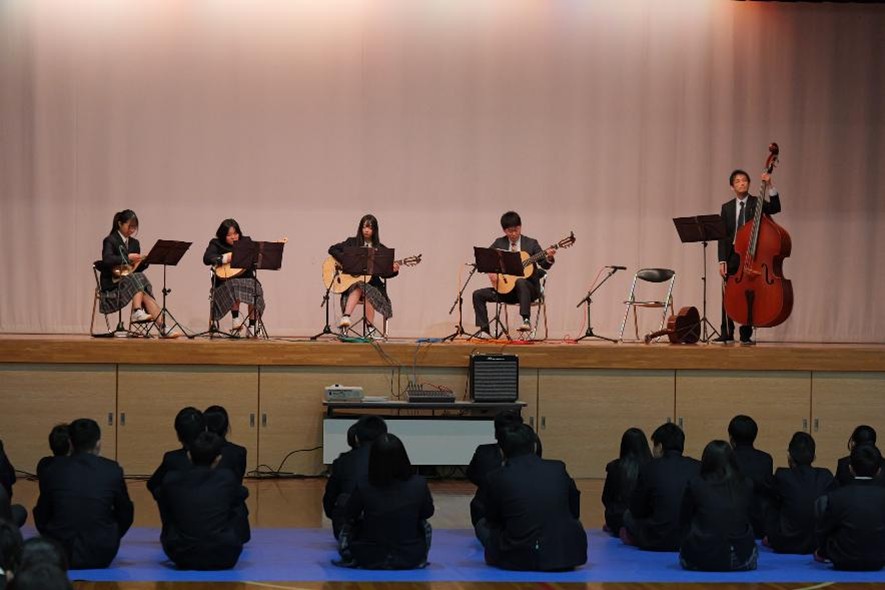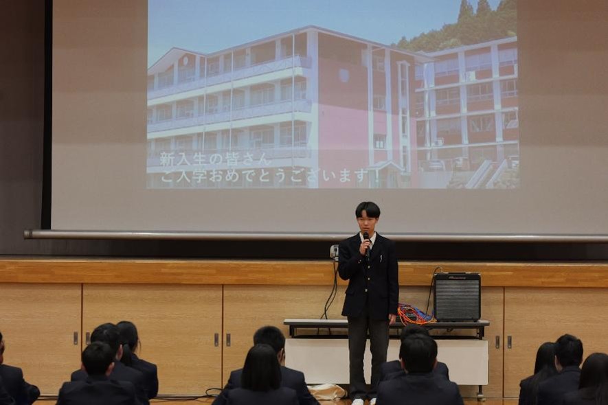 対面式、部紹介を行いました (R8/4/9) 投稿日時: 2026年4月9日 投稿者: 管理者 1年次生を迎える対面式と、1年次生の部活動加入の参考とするための部活動紹介が生徒会主催で行われました。 生徒会役員による映像による学校紹介、先生紹介クイズから始まり、ギター・マンドリン部と吹奏楽部による演奏、そして2・3年次生による部活動紹介と続きました。 わくわく、どきどき、これからの学校生活が楽しみになる、そんな時間を過ごすことができました。