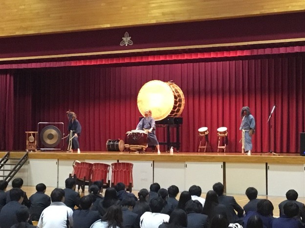 生徒(2名)と教員(校長先生)の和太鼓の体験コーナーもあり、とても盛り上がりました。