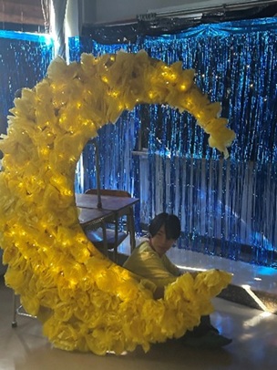 フラワーペーパーを貼ったあとダンボールが見えているところを黄色で塗って綺麗に月に見せる努力をしていました。