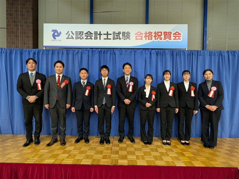 先日行われた朝日大学公認会計士試験合格祝賀会に本校校長と簿記部顧問が出席しました。朝日大学では、公認会計士試験において11名が合格し、そのうち、6名が本校を卒業した学生です。本校は朝日大学と簿記会計教育に関する高大連携協定を結んでいます。