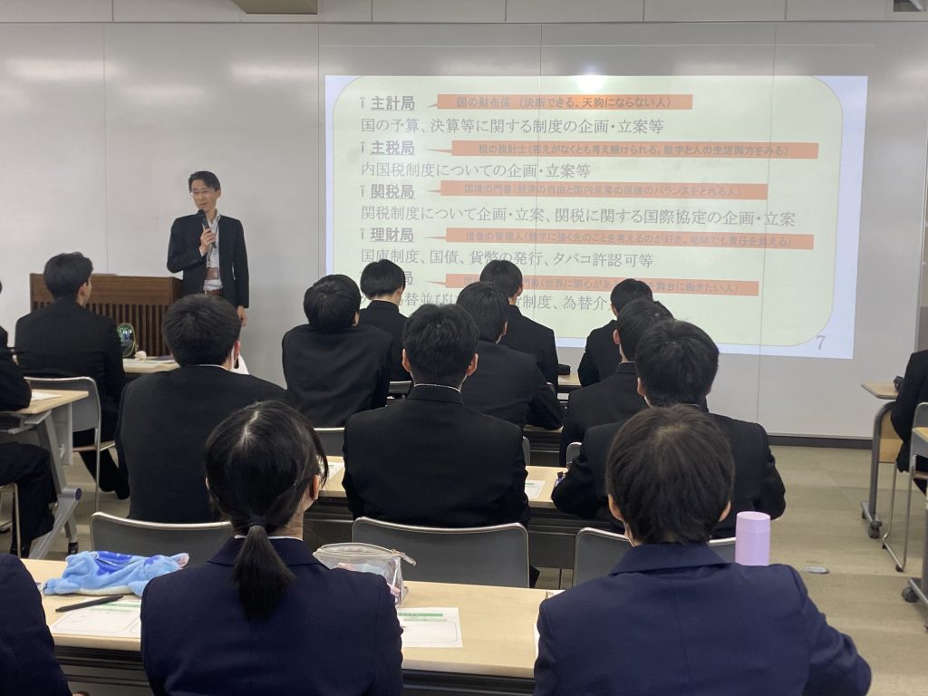 2月17日(火)に2年生会計科に対して、会計に関するキャリア講話を実施しました。財務省東海理財局の孫福良彦様を講師にお招きして、財務省の仕事内容や国家公務員の働き方などについてお話をいただきました。仕事に対する使命感や組織の役割など、今後の自分のキャリアを考える良いきっかけとなりました。