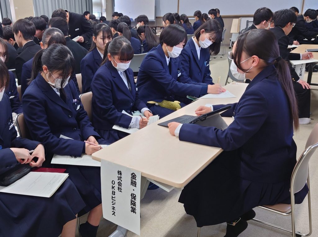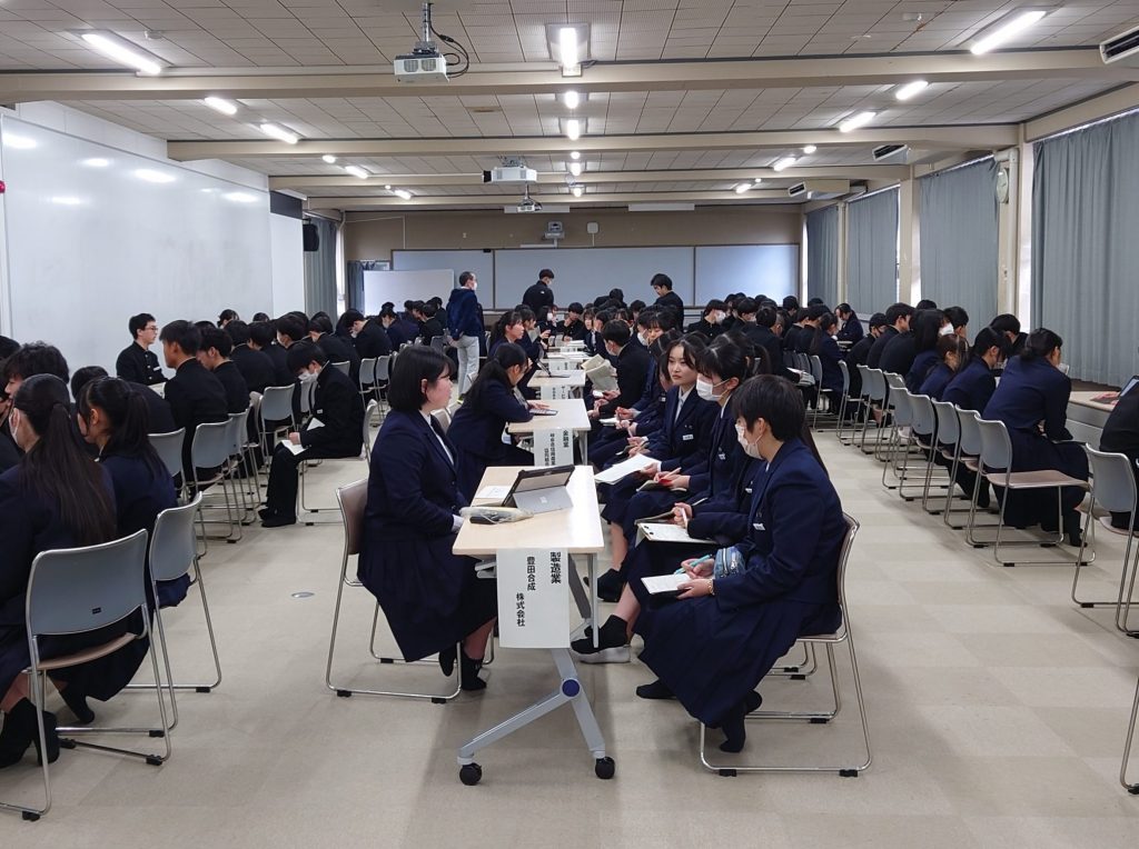 1月22日(木)6時間目に、進路が決定した3年生から1・2年生へ向けて、進路実現に関する経験談やアドバイスを聞く会を実施しました。3年生の就職内定者は、ブースごとに内定先企業を紹介し、志望理由や受験準備、企業研究の内容について発表しました。進学決定者は、所属する学科の1・2年生に対して、進路選択の経緯や、合格に至るまでの取り組みを伝えました。1・2年生は、先輩の話をメモを取りながら熱心に聞き、積極的に質問する姿も多く見られ、充実した時間となりました。