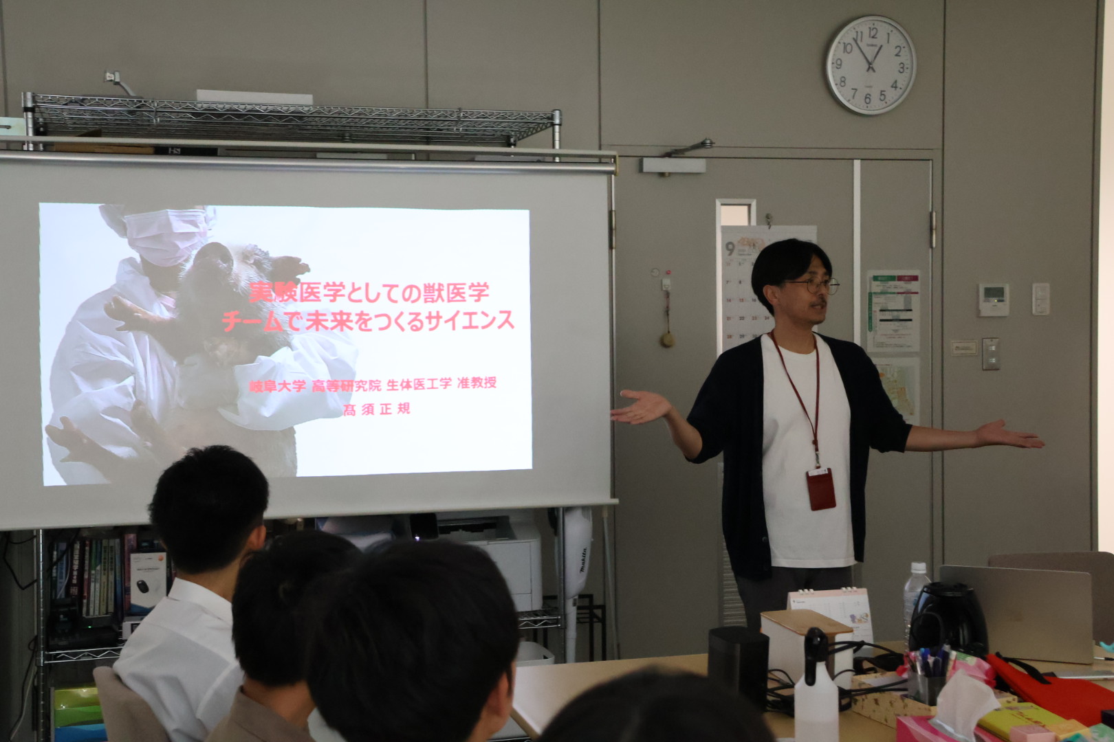 最初に、高須正規准教授より「実験医学としての獣医学 チームで未来をつくるサイエンス」と題して、なぜブタを研究対象にしているのか、何を目的としているのかなど研究室全体の壮大な目標を語っていただきました。