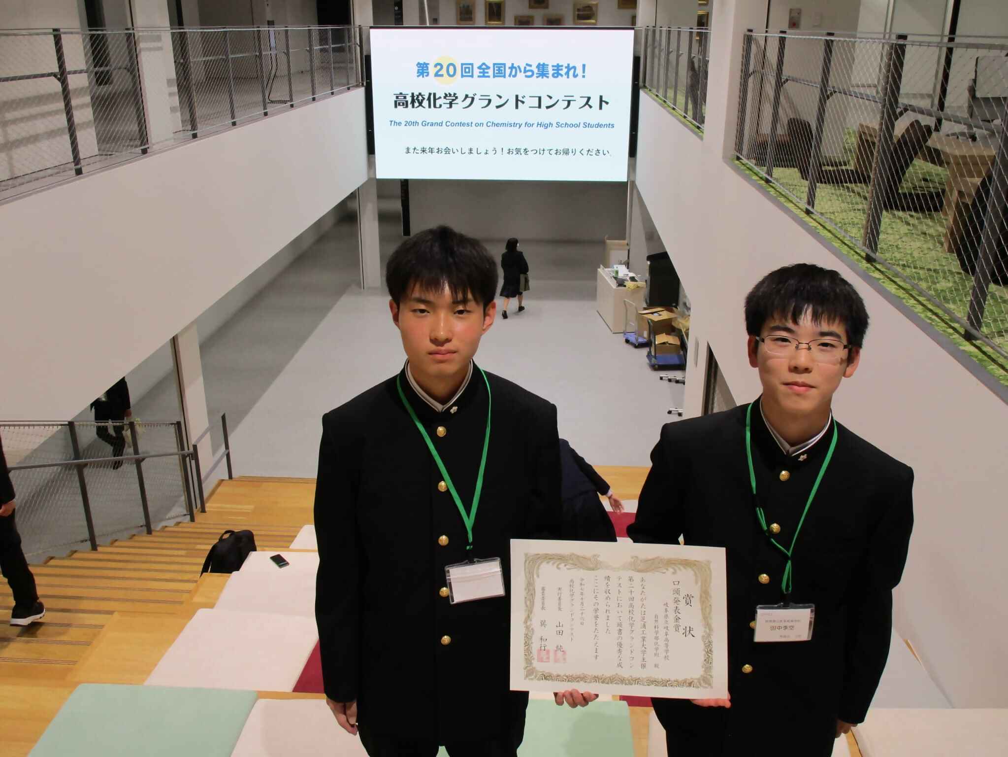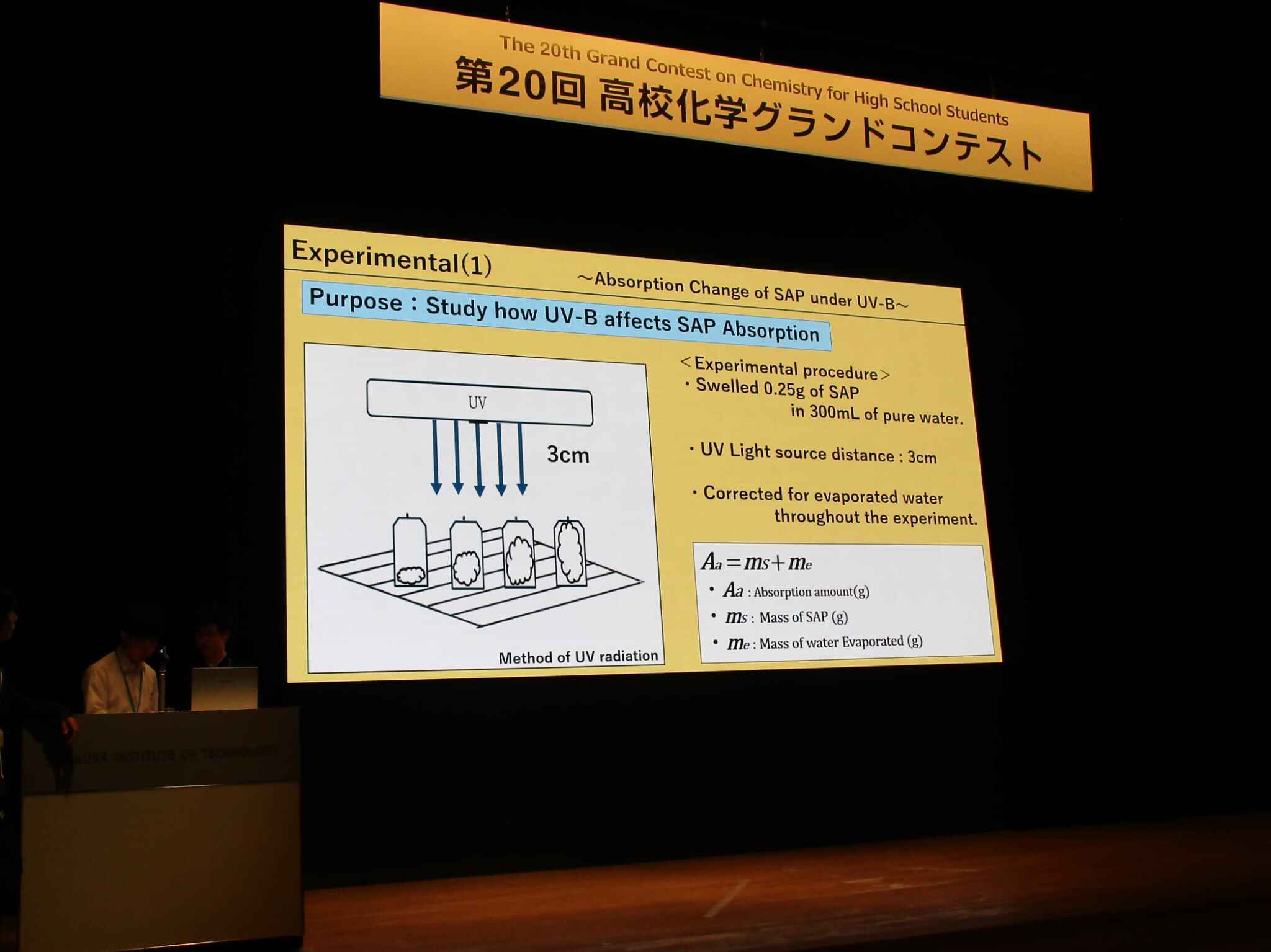 自然科学部化学班の1年生チームが、第20回 高校化学グランドコンテストで、「照射する紫外線の波長による高吸水性高分子の分解速度の変化」について発表し、金賞を受賞しました。
