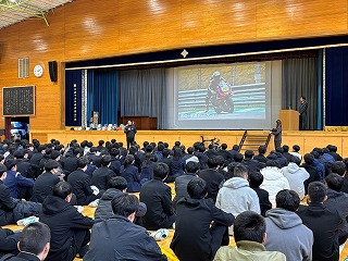 1月28(水)に全校生徒を対象に、レーシングライダ―渡邊一樹選手、梅本まどか様、株式会社トーエネック様、株式会社東海マルタカ様、株式会社SHOEI様をお招きし、安全講習会を行いました。