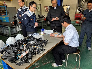 最初にレーシングライダーの渡邊一樹選手よりヘルメットの重要性と着用に関する講演に加えて、自動二輪の魅力紹介がありました。次に株式会社トーエネック様より、安全講習講話が行われました。落下物実験の動画では、ヘルメットの重要性がよくわかりました。最後に建築工学科、土木工学科、自転車競技部、自動車研究会、登下校でヘルメットを着用している生徒とのトークセッションを行いました。放課後にはバイク、ヘルメット、スーツ、ブーツなどの展示があり、普段あまり見ることのできないものに生徒は興味を持っていました。電気保安道具の着用体験や安全装置の体験も行われました。