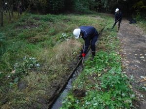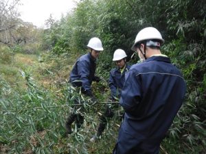 クヌギは高枝ノコギリを使い、枝打ちを実施しました。また圃場周辺で繁茂している竹の整備や、水路に溜まった土砂の除去など、環境を整える作業にも取り組みました。