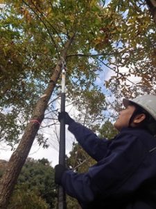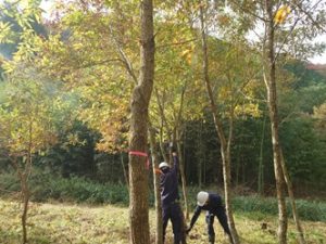 11月12日、3年次生が八幡町市島にある圃場で管理作業を行いました。原木シイタケの栽培に必要なクヌギの枝打ちや除伐をはじめ、周囲の雑木の整備を実施しました。さらに、持続可能な環境づくりを目指し、数年後を見据えた植樹にも取り組みました。