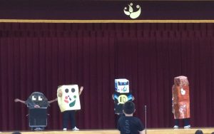 今年のマスコットキャラクターは中学部の生徒が考えてくれた「シンちゃん」です。縦割りグループのみんなでマスコットキャラクター達と写真を撮ったり、一緒に校歌を歌ったりして楽しむことができました。