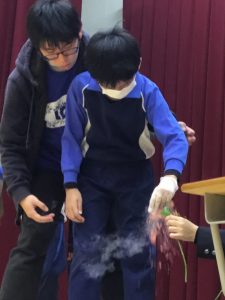 小学部は羽島高校科学部による科学ショーを見学しました。会場ではさまざまな実験が行われ、不思議な体験に驚きの連続でした。段ボールから空気の輪が飛び出す実験では、「わぁ!」と歓声が上がっていました。科学の楽しさを感じる、わくわくいっぱいの時間となりました。