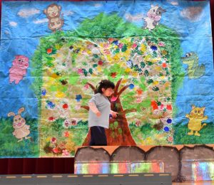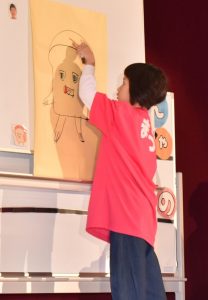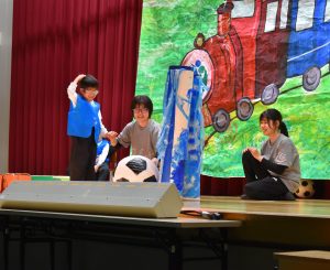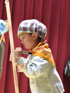 昔話『かさじぞう』の世界に入り込み、力いっぱい大根を抜いたり、小判やタイを貼ったり、心をひとつにして頑張りました。無事、地蔵にかさをかぶせることができ、子どもたちも地蔵も、笑顔で温かい気持ちにあふれた発表となりました。