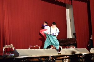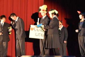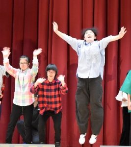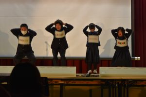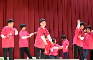 楽しかった修学旅行の思い出を、ストーリー性のある劇にして披露しました。笑いあり、思い出ありのステージの最後には、全員で息の合ったダンスも踊り、見ている人も自然と笑顔になる、温かいステージとなりました。