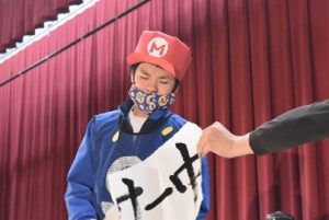 修学旅行のUSJで体験した「マリオ」を題材に、体育や音楽、自立活動、美術等で学習した中でできるようになったことや得意になったことを織り交ぜながら、クッパとの対決の為に各グループで練習を重ねました。中学部として最後の学校祭、緊張もありましたが全員で「エンジョイ」で最後までやりきることができました。