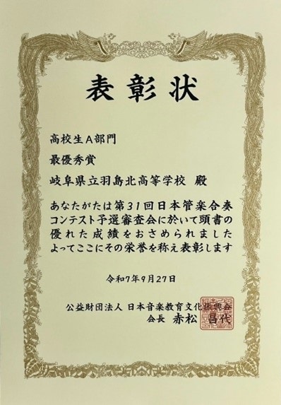 投稿日: 2025年10月6日 投稿者: 管理者[吹奏楽部] 第31回日本管楽合奏コンテスト全国大会出場決定! 9月に行われた日本管楽合奏コンテスト予選審査会で、最優秀賞をいただき、11月に行われる全国大会に出場することが決定しました!昨年度に続き2年連続で出場をします!全国大会で聴いてくださる方々の心に残るような素敵な演奏ができるように、これからも精進していきます。応援よろしくお願いします! 全国大会 2025年11月3日(祝) 出演順16番 演奏時間:12:56~13:08 文京シビックホール 大ホール(東京都文京区)