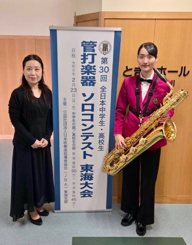 2月23日(月・祝)に浜松学芸中学・高等学校ときわホールで行われた第30回全日本中学生・高校生管・打楽器ソロコンテスト東海大会において岐阜県代表として出場したバリトンサクソフォンの淺野笑瑚(3年)が金賞を受賞しました! 応援ありがとうございました!!