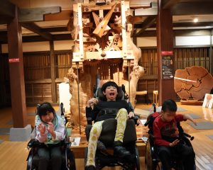1日目はスクールバスで世界生活文化センターに行きました。はじめに大きな木のからくり時計を見ました。音楽に合わせて虫が動く様子をじっと見たり、針が動く音を聞いたりする様子がみられました。展示されている椅子に座ったり椅子に触ったりして、木のつるつるした感触や布のザラザラした感触も味わいました。