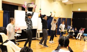 児童生徒が一人ひとり全校の前に出て、好きなものを紹介したり、得意なことを実演したりして自己紹介をしました。一緒に発表する先生に笑顔を向けたり、仲間の発表を見て楽しそうに声を出したりする姿がたくさん見られました。新転任の先生たちによるダンスも、手拍子と笑顔に包まれた楽しい時間となりました。