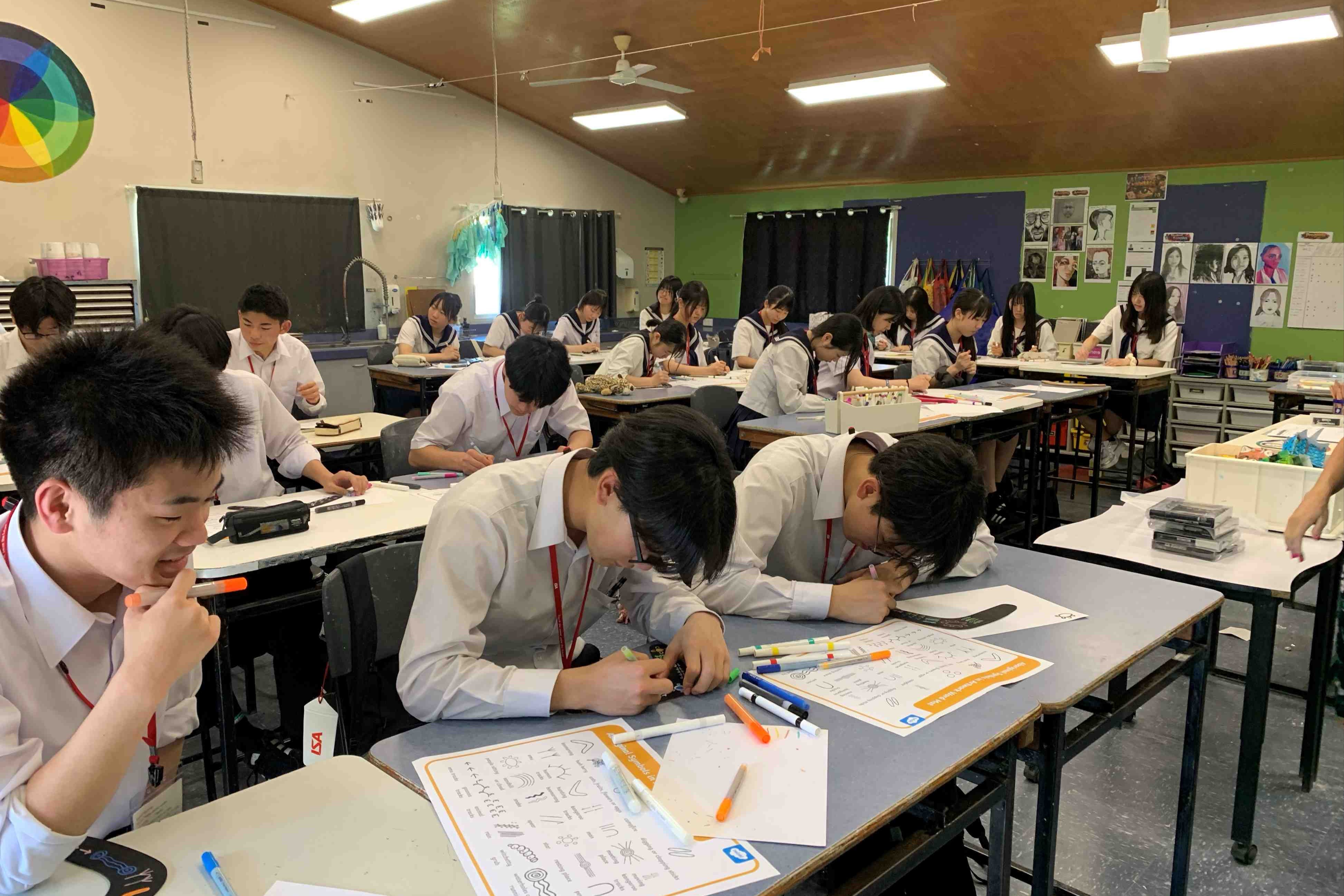 翌日の午前は、現地の先生による授業を英語で受けました。お昼にはバディと過ごしながらホストファミリーに用意してもらったお昼ご飯を堪能し、午後はオーストラリアの原住民・アボリジニについて学びました。昔から使われているシンボル(意思疎通のための絵)や、楽器(ディジュリドゥ)の演奏を見ました。日本へのお土産としてブーメランをいただき、それにシンボルの絵を描くという時間もありました。