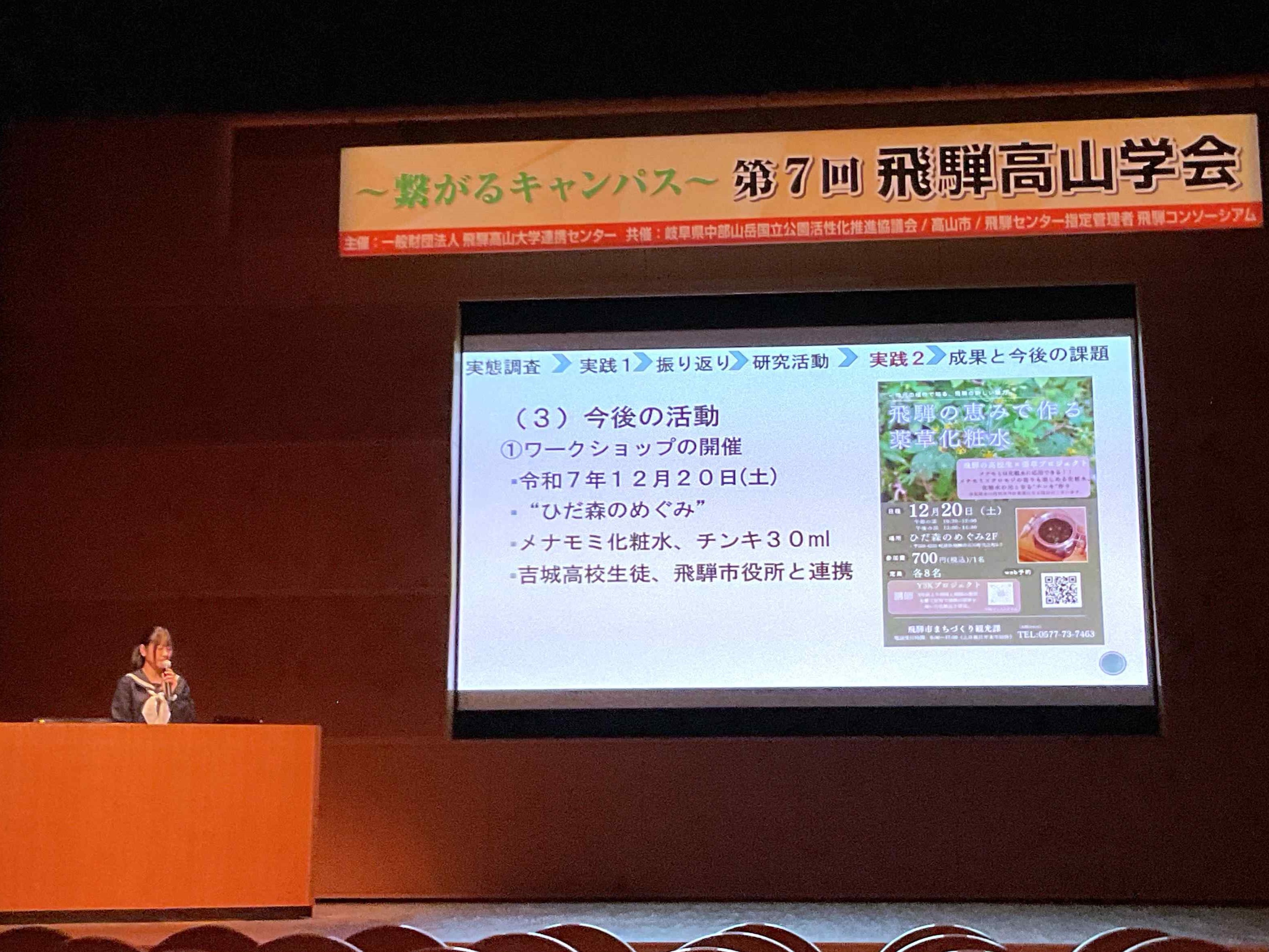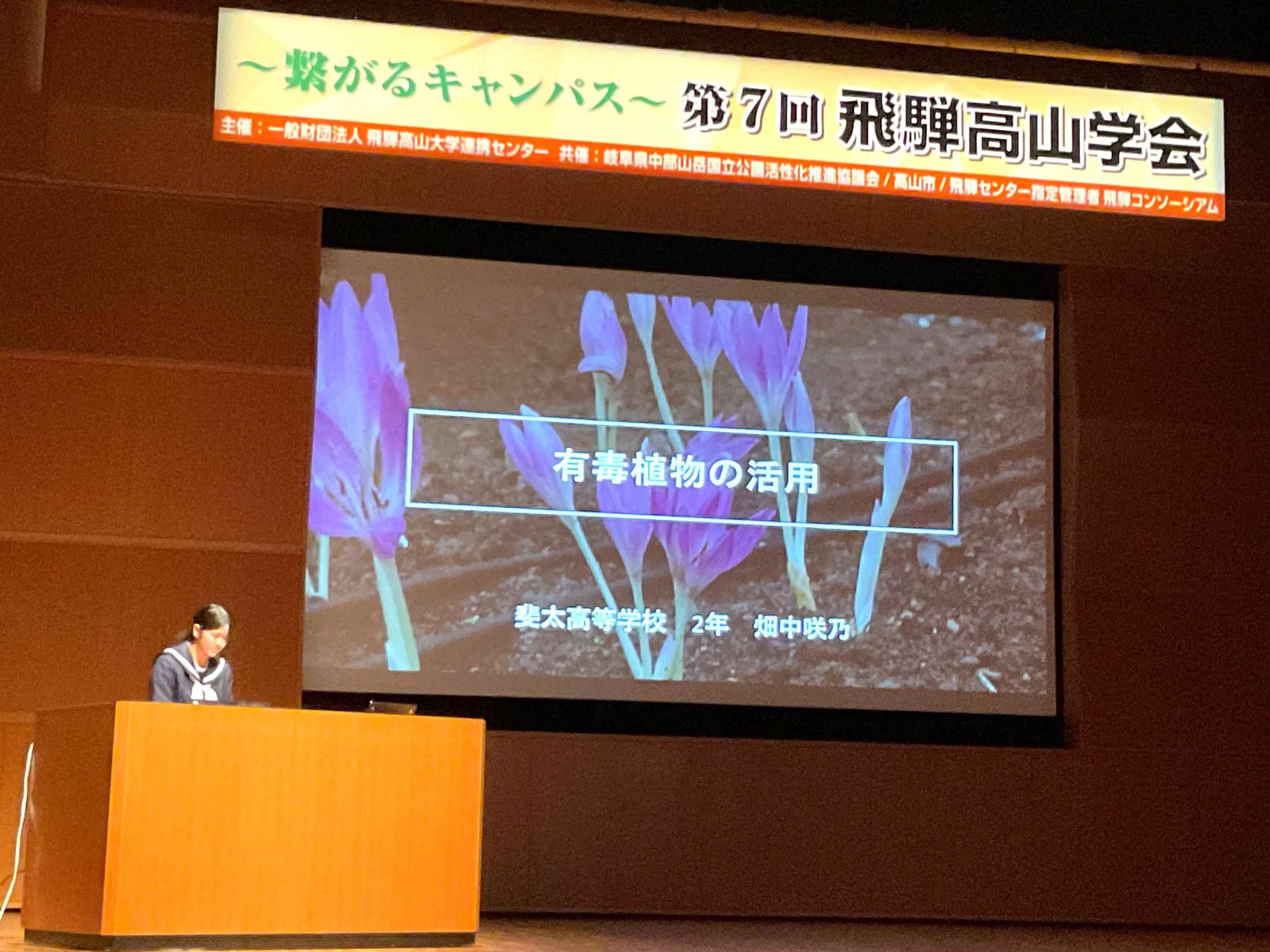 11月29日(土)、30日(日)、飛騨・世界生活文化センターで開催された第7回飛騨高山学会で、本校生徒が2名発表を行いました。飛騨をテーマに探究活動・研究を進める大学生、大学関係者が多数発表する中、これまでの研究成果の発表のみならず、質疑にも堂々と対応しました。