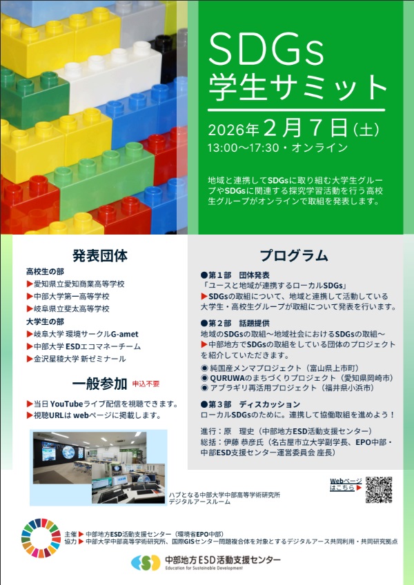 令和8年2月7日(土)に、中部地方ESD活動支援センター(環境省EPO中部)主催で、オンライン上で開催されたSDGs学生サミットに、2年の東田花奈さんと平野希空さんが参加しました。