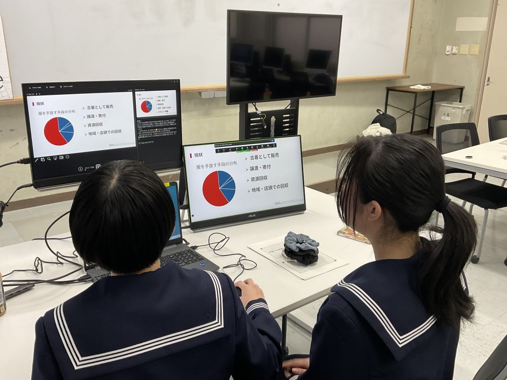 環境省のデータを分析し、衣服を手放す手段として60%がゴミとして廃棄される現状から、衣服のリメイクやリフォームによる衣服への愛着の重要性を、リメイクやリフォームの実践も含めて探究してきました。さらに、学生サミットでは、その探究の成果とSDGsを関連付けて発表しました。