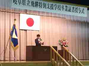 3月6日(金)に高等部の卒業証書授与式が執り行われました。今年度は、学校運営協議会から、当校PTA会長様、新宮まちづくり協議会様、飛驒特別支援学校高山日赤分校PTA会長様、山ゆり学園施設長様、高山市社会福祉協議会事務局長様、に来賓として御臨席を賜りました。また、高等部在校生、全職員も式に参加し、一緒にお祝いしました。