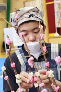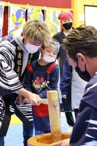 殿町青龍会との餅つき交流会 投稿日時: 2025年12月19日 投稿者: 管理者 青龍会の皆さんと一緒に餅つき、鏡餅作り、花餅作りをしました。 餅つきの「ぺったんぺったん」という音、みんなの掛け声、うまくつけたときの歓声が体育館に響き渡り、真剣な表情も笑顔もたくさん見られました。鏡餅作りでは、柔らかい餅の感触を楽しみながら作ることができました。花餅作りでは青龍会の方と一緒に、紅白の餅をつけていくことができました。それぞれの思いのこもった美しい花餅ができあがり、新しい年を迎える準備ができました。 青龍会の皆さん、ありがとうございました。